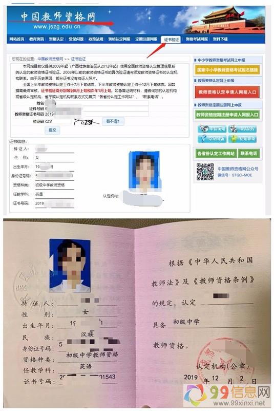202099信息网www.99xinxi.net年春季教师资格证认定评审流程线上报名,中国教师网可查询,正规出证