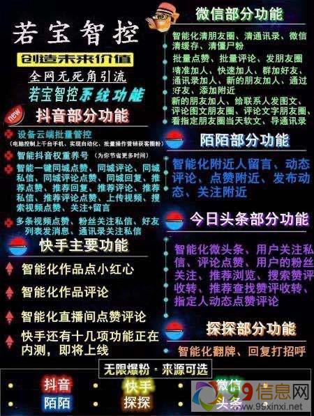 系统集养号、发布视频、自动关注、精准引流推广、热门截流、同城引流、批量化管理的一款软件,只需要通过一台电脑就能够操作多部手机。控制多个手机去对主播点赞、评论、关注、私信直播间互动等,而且还可以对主播的粉丝进行关注和私信营销,以及对自己的粉丝和关注的对象进行私信来源www.99xinxi.net