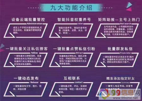 若宝智控是一套专门针对短视频APP进行批量操作的一套智能营销系统,代替了抖音,快手运营的各种手工操作及规模化操作。一个人就可以操作上百甚至上千台手机,全自动化模拟人工操作,抖音上批量点赞,评论,私信,转发,完播,不断的增加自己视频的曝光量,辅助大号上热门,从同行视频截留活跃粉丝,直播间自动发言,可以提前设置沟通内容和主播进行互动,还可以点击购物车购物99信息网